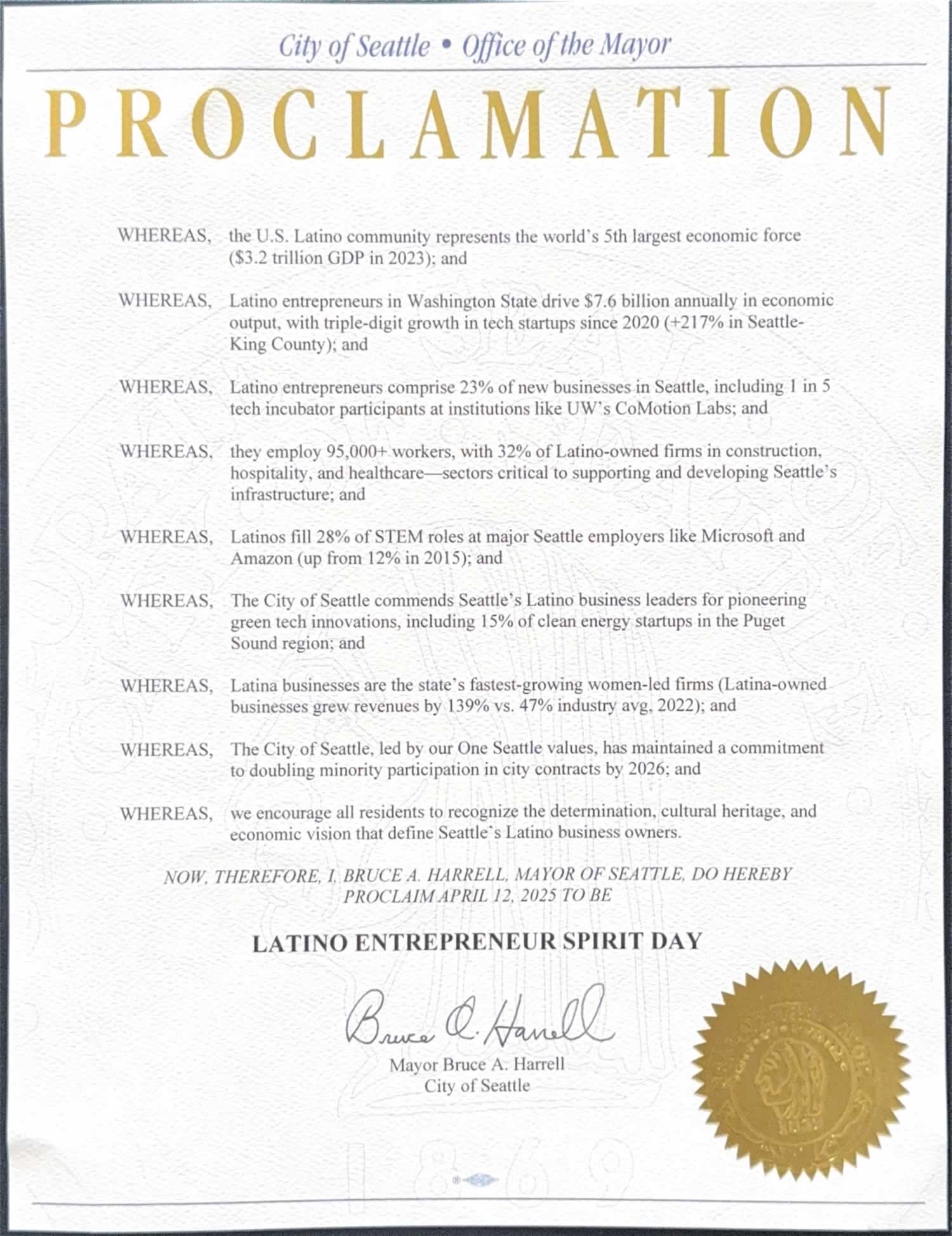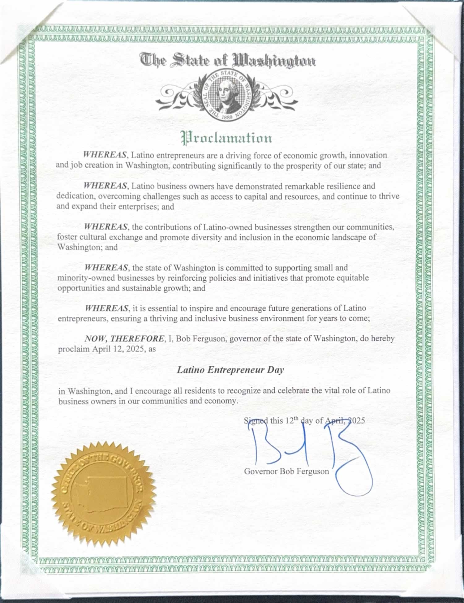 Governor Bob Ferguson Proclaims April 12 as Latino Entrepreneur Day in Washington State